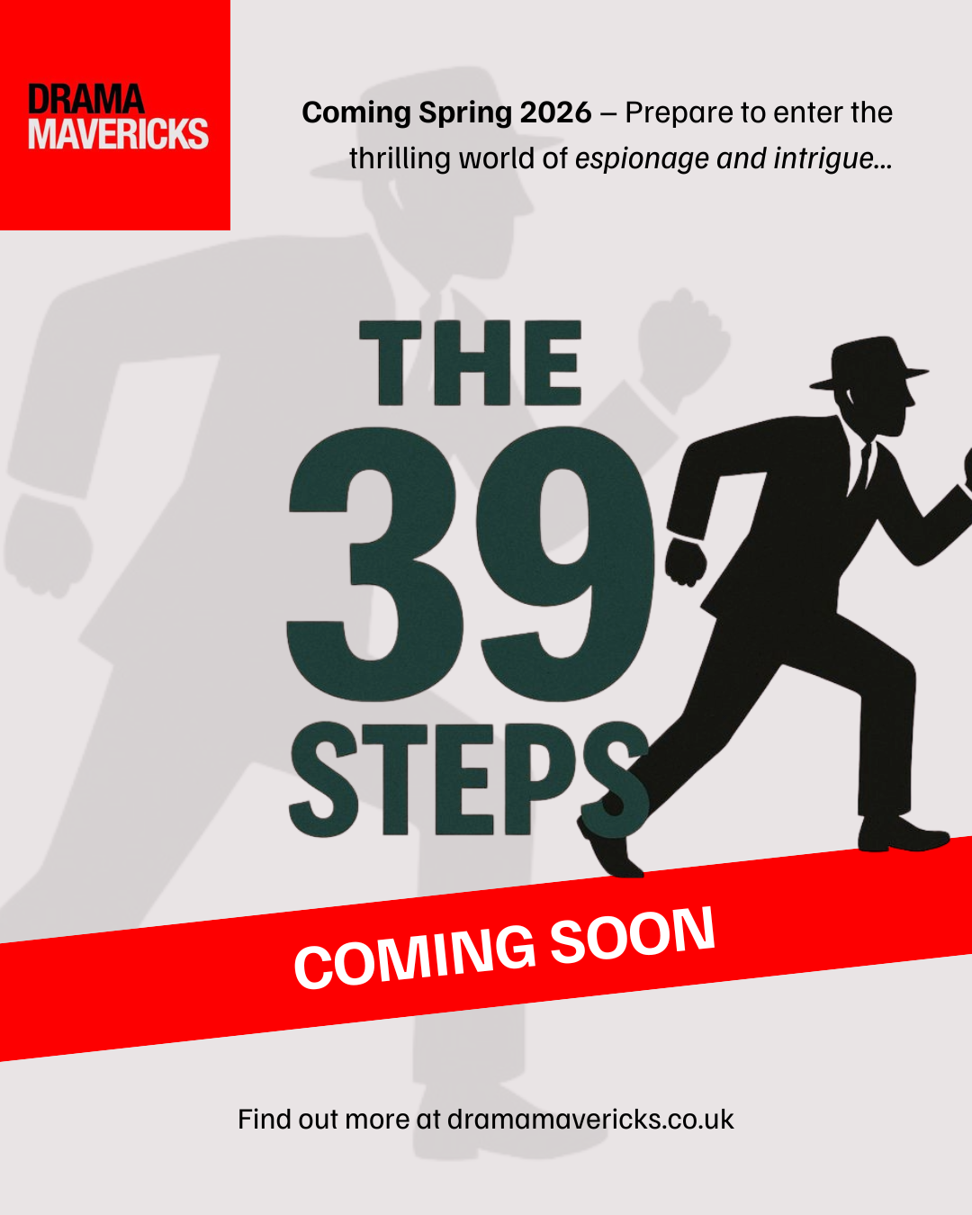 Drama Mavericks’ are proud to present The 39 Steps - a fast-paced, inventive comedy thriller in which four actors play over 130 characters, supported by imaginative staging, physical comedy, and rapid, visible transitions.